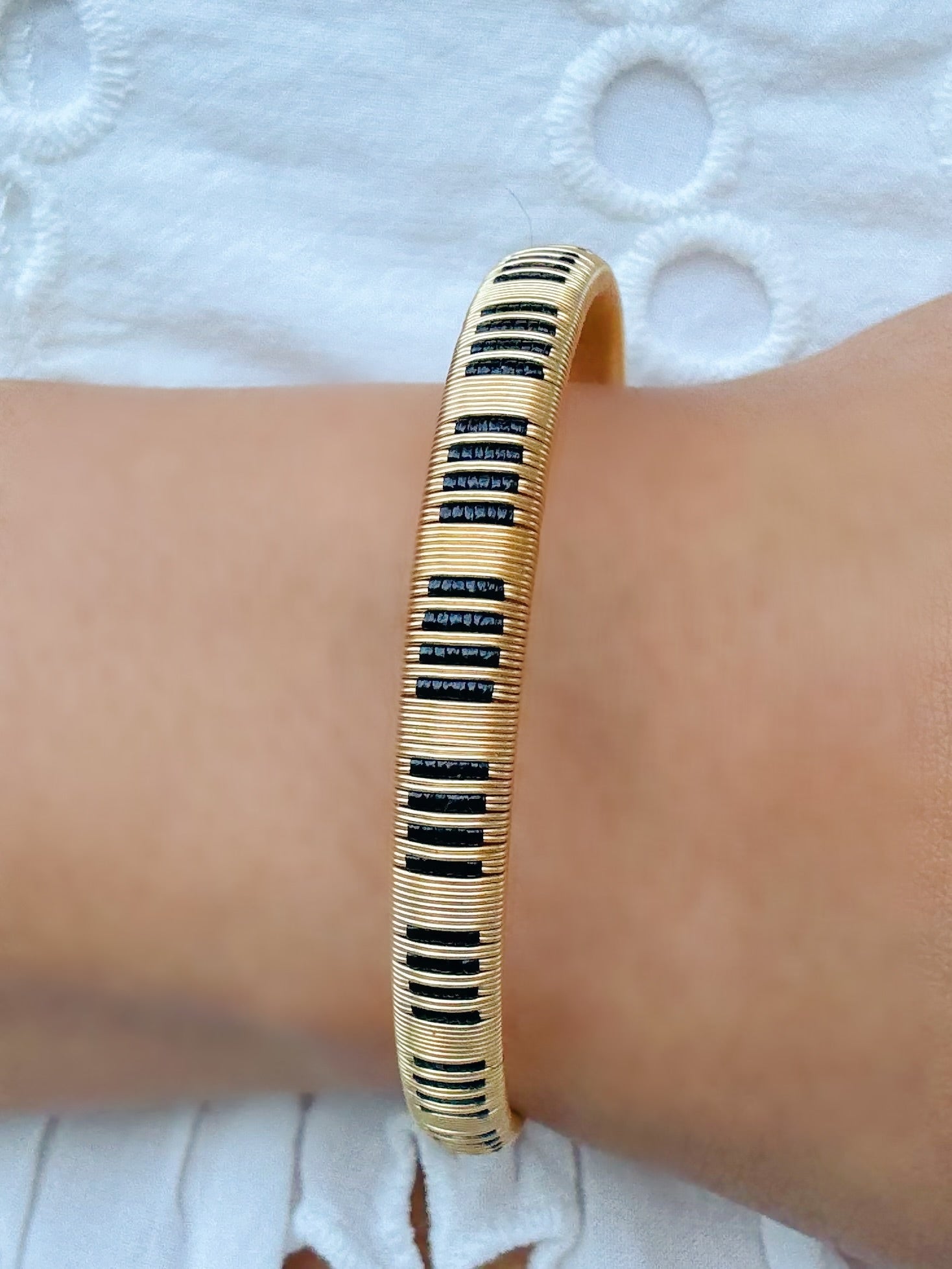The “Noche” Delicate Bangle features a sophisticated black striped palm pattern intricately woven with gold metal wiring. This artisanal design adds subtle texture and an elegant touch, making it an ideal accessory for gameday or elevating any outfit with a refined splash of color.