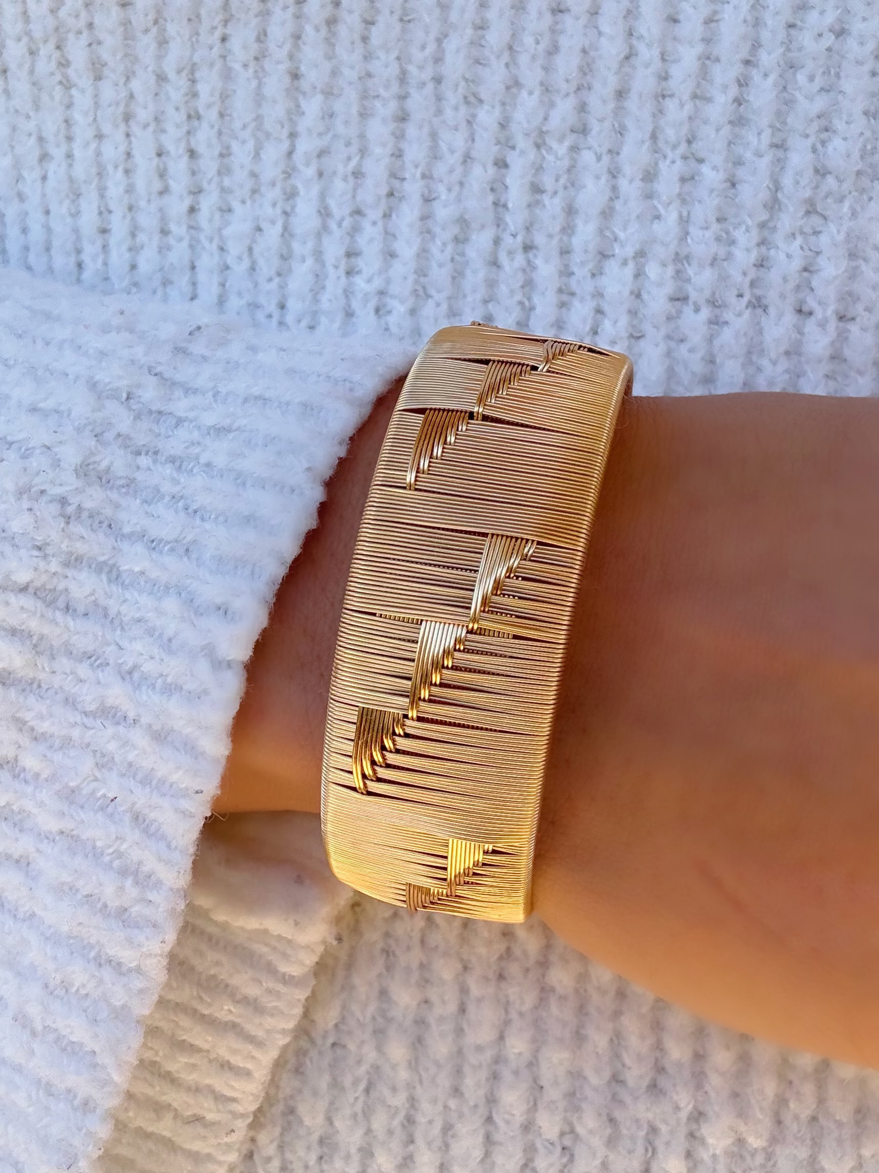The “Trio” Statement Bangle is a versatile addition to any jewelry collection. The all-gold triangle pattern is elegant, making a statement at any special occasion. With its unique design, it can also be stacked with other pieces for a personalized look.